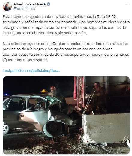 El martes por la noche, la Ruta Nacional 22 volvió a ser el escenario de un choque fatal. Un auto impactó contra la barrera de hormigón que divide los carriles, producto del choque dos personas murieron. El gobernador de Río Negro, Alberto Weretilneck, manifestó que el accidente se "podría haber evitado" si la ruta estuviera señalizada de la manera correcta y pidió que se transfiera esta ruta a las provincias de Río Negro y Neuquén.