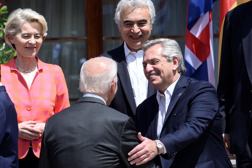 El presidente Alberto Fernández clamó hoy en la cumbre del G7 por la necesidad del «diálogo» para alcanzar el «cese de hostilidades» entre Rusia y Ucrania. También abogó «por la construcción de una nueva arquitectura financiera internacional que incluya a las periferias del mundo» y celebró los debates sobre «impuestos que corrijan la concentración del ingreso».