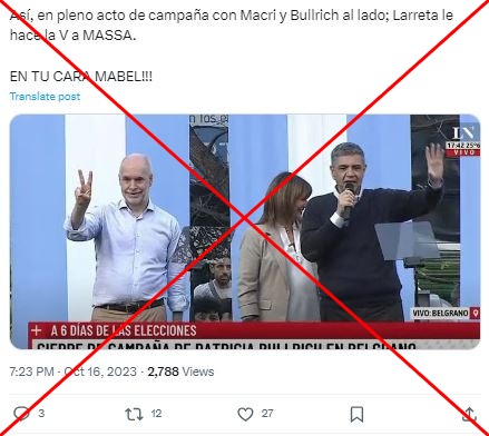“Así, en pleno acto de campaña con Macri y Bullrich al lado; Larreta le hace la V a MASSA”, se lee en una publicación en X que incluye una captura del canal  LN+ en la que se ve al jefe de Gobierno porteño, Horacio Rodriguez Larreta, haciendo un gesto con sus dedos índice y medio. Las publicaciones aluden al símbolo peronista de la “V”, y al candidato presidencial de la coalición oficialista Unión por la Patria, Sergio Massa.