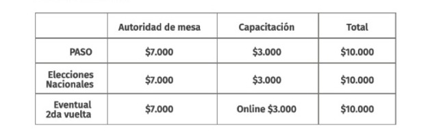 También se establece que en caso de participar de las 3 elecciones también habrá un plus de $10.000 y en caso de no haber segunda vuelta y participar de las dos elecciones este plus será de $7.000.