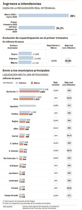 El impacto de la recesión económica en los ingresos llegó a los municipios rionegrinos. La Provincia completó el envío de su última coparticipación, con un derrumbe visible porque los montos directamente fueron inferiores nominalmente a los de las anteriores transferencias. Ya no se trata solo del deterioro real por el impacto de la inflación, los registros (que corresponden a los ingresos provinciales de marzo) fueron del 12% al 14% inferiores a los mes anterior.