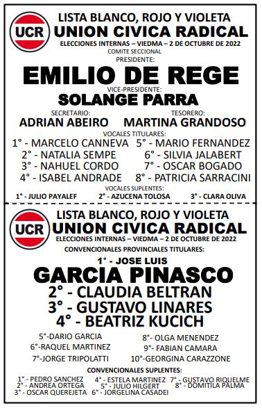 Cerca de 5.000 afiliados están habilitados para votar en las elección interna que definirá la próxima conducción del comité seccional Viedma de la Unión Cívica Radical que tiene como aspirantes a la exconcejala Genoveva Molinari, por la lista Blanco, Rojo y Rosado; y a Emilio De Rege, por la Blanco Rojo y Violeta.