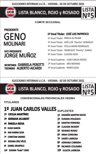 La lista de Molinari propone a Jorge Muñoz, como vicepresidente; a Gabriela Perotti, como secretaria; y a Alberto Aicardi como tesorero; mientras que José Luis Pappatico encabeza el grupo de vocales y los primeros candidatos a convencionales provinciales son Juan Carlos Vallés, Cecilia Martínez, Germán Jalabert y Ángela Nieva.