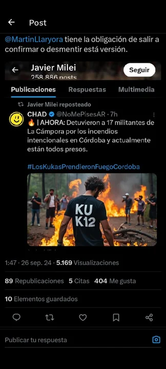A través de un repost, el mandatario responsabilizó a la agrupación kirchnerista La Cámpora de los incendios que afectan a la provincia de Córdoba, señalando que 17 de sus militantes habían sido detenidos. Sin embargo, tanto el gobierno de Córdoba como la justicia provincial desmintieron categóricamente esta información.