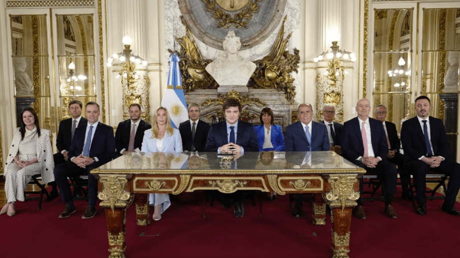 Su hermana Karina Milei, secretaria general, a quien le agradeció su trabajo sobre el final del discurso, y Guillermo Francos, jefe de Gabinete, se ubicaron a los costados de Milei; con el resto de los ministros a su alrededor.