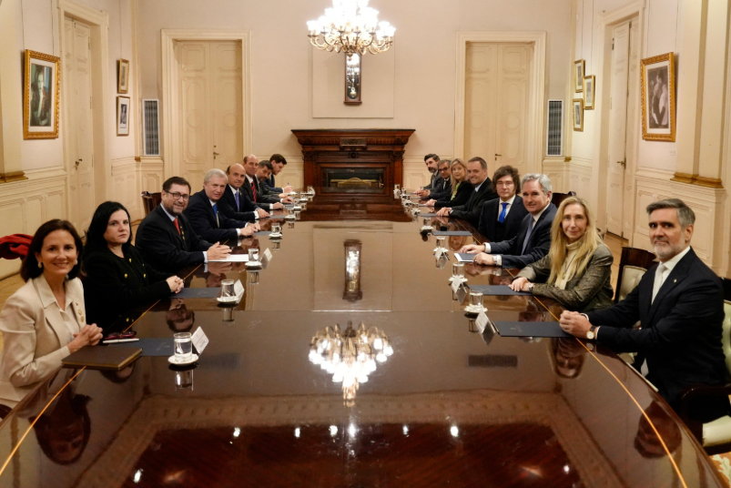 Después, hubo otro encuentro en el Salón Eva Perón con otros funcionarios del país vecino en el que también participaron Karina Milei; el jefe de Gabinete, Manuel Adorni; el ministro de Economía, Luis Caputo; la ministra de Seguridad, Alejandra Monteoliva; el secretario coordinador de Infraestructura, Carlos Frugoni; el secretario de Relaciones Económicas Internacionales, Fernando Brun; y el subsecretario de Política Exterior, Juan Navarro.