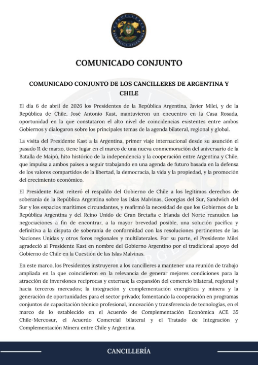 En un comunicado en conjunto, el presidente Kast reitiró «el respaldo del Gobierno de Chile a los derechos de soberanía de la República Argentina sobre las Islas Malvinas, Georgias del Sur, Sandwich del Sur y los espacios marítimos circundantes».