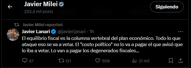 «El equilibrio fiscal es la columna vertebral del plan económico. Todo lo que ataque eso se va a vetar. El ‘costo político’ no lo va a pagar el que avisó que lo iba a vetar. Lo van a pagar los degenerados fiscales…», señaló Lanari en su mensaje, que fue retuiteado por el Presidente.
