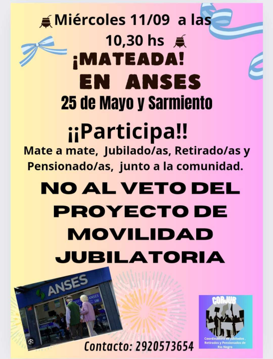 La Coordinadora de Jubilados, Retirados y Pensionados de Río Negro se concentrarán en Viedma. La cita es a las 10:30 y se convocarán en el edificio Anses, ubicado sobre calle 25 de Mayo y Sarmiento. Será una mateada e invitaron a jubilados, pensionados y a toda la comunidad.