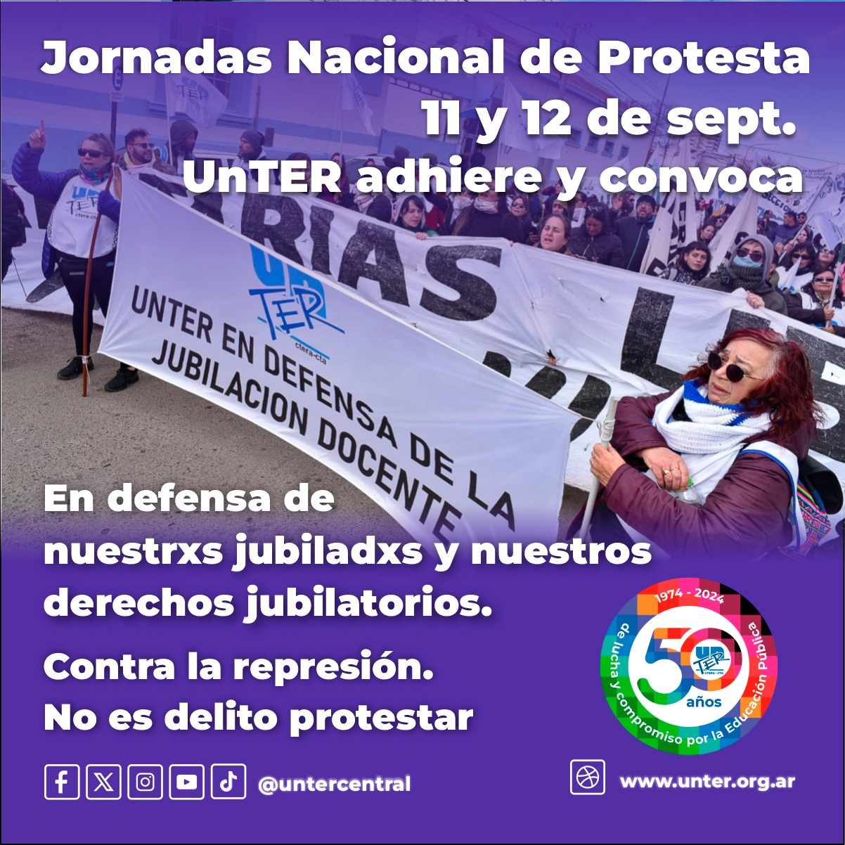 Unter también se plegará a partir de sus jornadas de protesta. De esta manera, el gremio que nuclea a los docentes de Río Negro convocó: «Este miércoles 11 y jueves 12 de septiembre nos manifestamos contra la represión a jubiladxs, el veto presidencial, cualquier reforma jubilatoria que ajuste, el presentismo y la declaración de esencialidad».