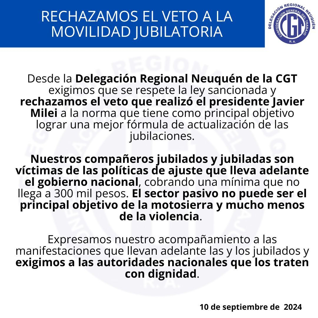 La CGT de Neuquén, a través de un comunicado, exigió que se respete la normativa sancionada por el Congreso y se condenaron las políticas de ajuste que afectan al sector pasivo. Además, destacó que el sector pasivo no debe ser el principal objetivo de la «motosierra», haciendo referencia a las declaraciones y acciones del gobierno nacional.