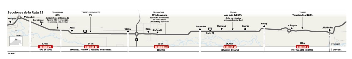 La particularidad del segundo tramo es que allí la Ruta 22 se transformó en autopista, y esto generó la paralización de las obras en las dos ciudades más importantes de los sectores 3 y 5: Roca y Cipolletti.