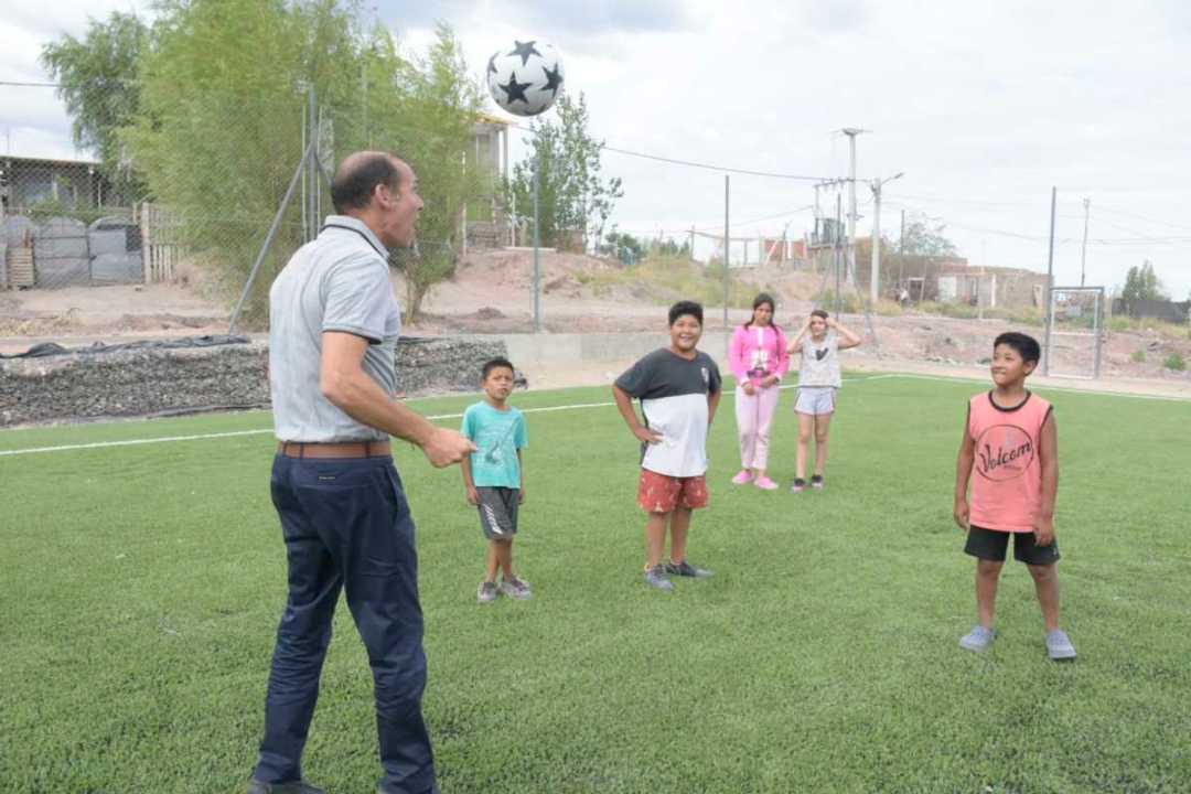 El gobernador Omar Gutiérrez inauguró hoy una nueva cancha de fútbol con césped sintético en la toma 7 de Mayo, junto con la ministra Alejandra Piedecasas y los candidatos en campaña Mariano Gaido (en busca de la reelección) y Marcos Koopmann, candidato a gobernador por el oficialismo. Gutiérrez dijo que la cancha barrial era la número 55 y que en total, si se suman las del resto de la provincia, el césped sintético llega al centenar. «Más de 40, seguro hay en el interior», dijo.