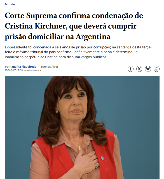 Este martes se conoció la decisión de la Corte Suprema de Justicia de ratificar la condena contra Cristina Kirchner por la causa Vialidad. Además del escenario local y nacional, la noticia repercutió en la política y prensa internacional.