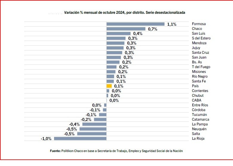 Mientras tanto, Neuquén exhibió una recuperación del 2,2% interanual, representando la mayor suba del país en esta medición, lo que sugiere una base sólida de crecimiento que enfrenta dificultades coyunturales, según el informe de la secretaría de Trabajo, Empleo y Seguridad Social del ministerio de Capital Humano.