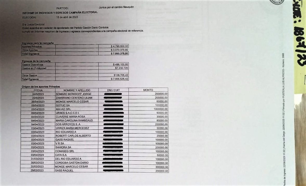 El informe sobre ingresos y gastos de campaña es un requisito que la ley electoral 3053 le exige a todas las agrupaciones y deben presentarlo dentro de los 60 días posteriores a la elección. En el caso de Juntos por el Cambio, la alianza declaró haber utilizado unos 7,8 millones de pesos que provinieron de un listado de 20 aportes económicos de empresas y particulares.