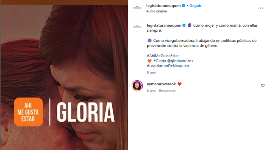 Los spots promocionales se identificaban con el color naranja y la frase “Ahí me gusta estar” bajo la firma #Gloria. “Cada vez que entro a la Legislatura pienso en todo lo que falta trabajar para mejorar la vida de mi gente”, decía uno de los spots de los 11 millones, donde se veía a la funcionaria caminando las escaleras de la Legislatura y mirando el horizonte desde la terraza.