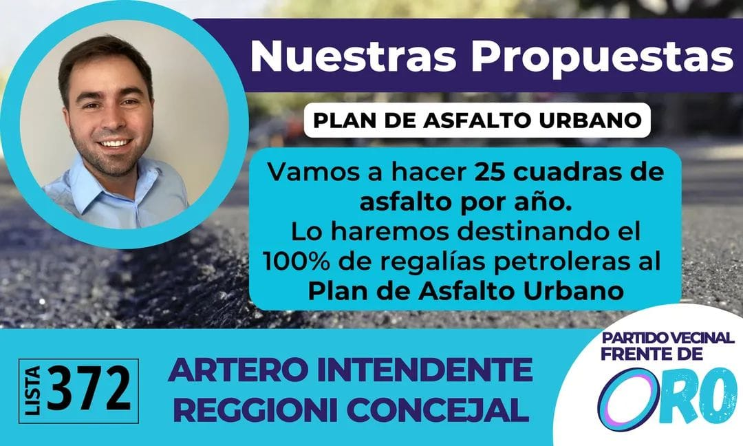 El candidato a intendente, Christian Artero, prometió un Plan de asfalto urbano para Fernández Oro. La propuesta fue difundida en sus redes sociales mediante una publicación en la que plantea «revertir» la situación en la que se encuentra la ciudad.