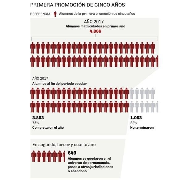 Según el informe gubernamental, ingresaron 3.154 a Quinto en el 2021, que equivale a un 82% de los que cursaron Primero en el 2017. Otra referencia: casi un 65% del registro original.