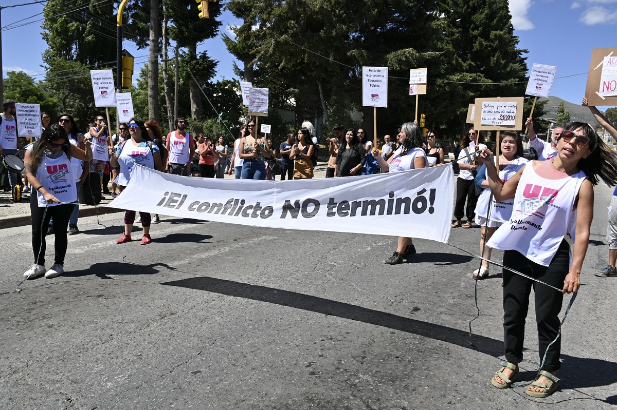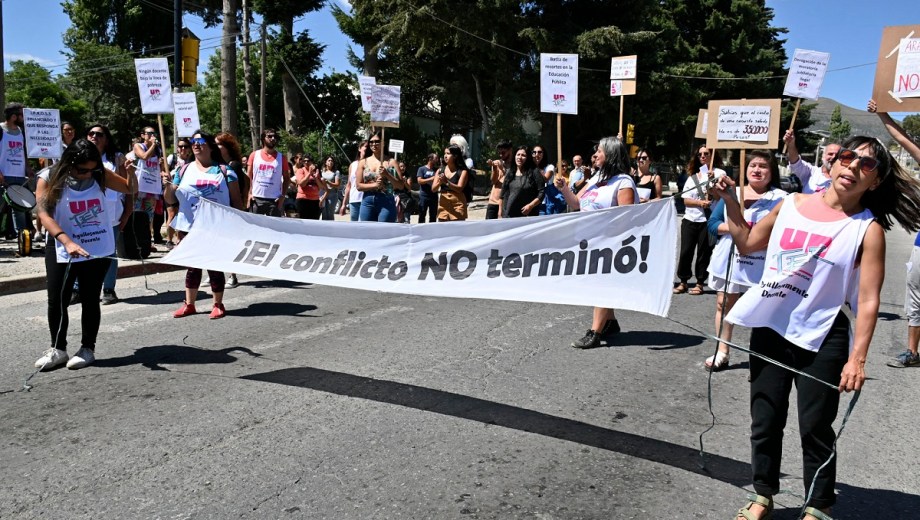 El día de la vuelta de los docentes a las escuelas estuvo signado hoy por una protesta gremial que incluyó un recorte de dos horas en la jornada laboral para cada turno y una movilización en la esquina de Onelli y Mascardi, con fuertes críticas a la gobernadora Arabela Carreras.