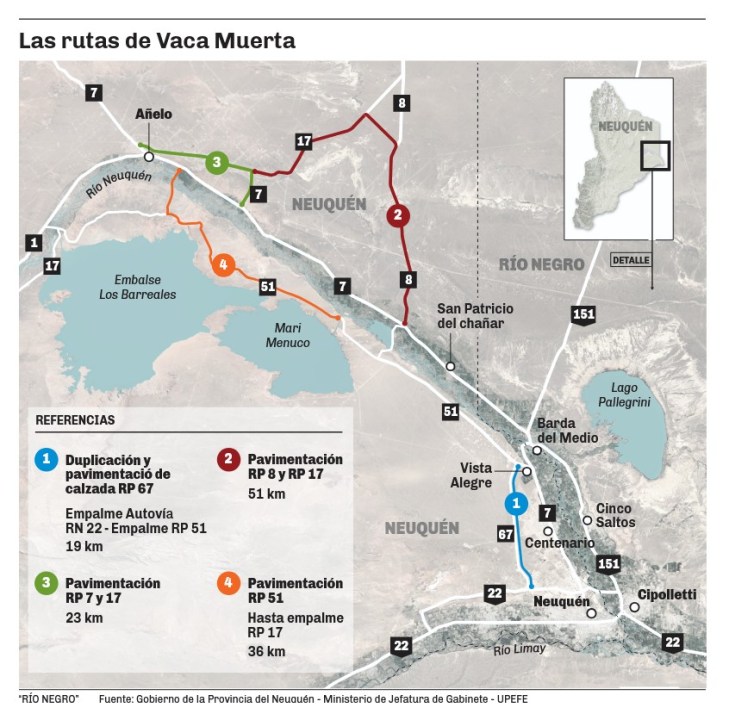 Desde el cruce de las rutas 7, 8 y 51 la obra de asfalto financiada por las petroleras permitirá sacar hacia el norte los camiones, en ese punto del trayecto, del corredor hoy colapsado.