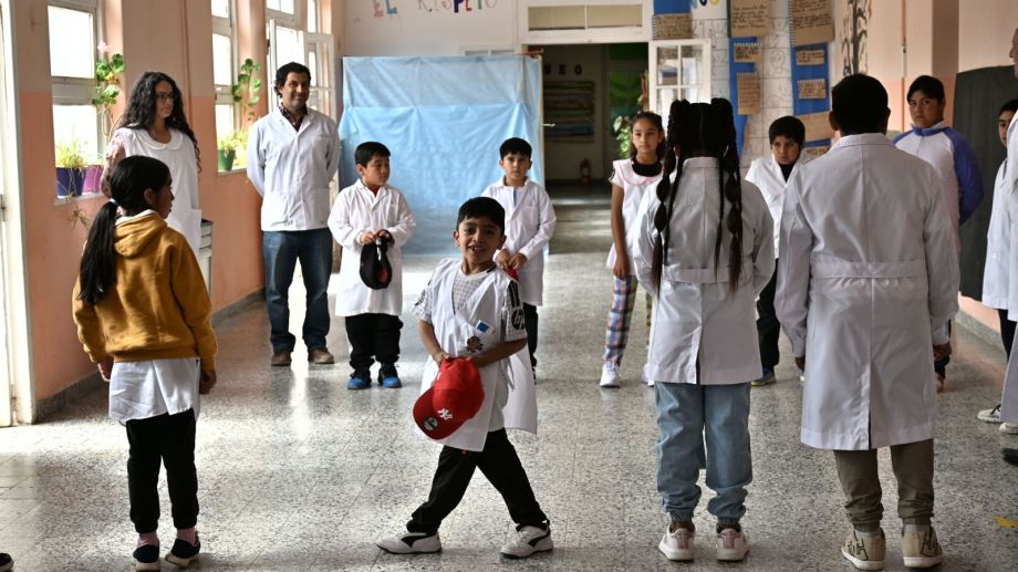 La galería ancha y luminosa queda espaciosa para el puñado de niños que la habitan. Este año son 15 alumnos que con los guardapolvos relucientes, llegaron con alegría a pararse en ronda para recibir las palabras de bienvenida de la directora y cantar Aurora mientras la bandera subía en el mástil del patio. El primer día de clases de la Escuela Hogar 104 “Pichi Queche Ruca” de Clemente Onelli, en plena estepa rionegrina, pasó rápido, a puro canto y con novedades.