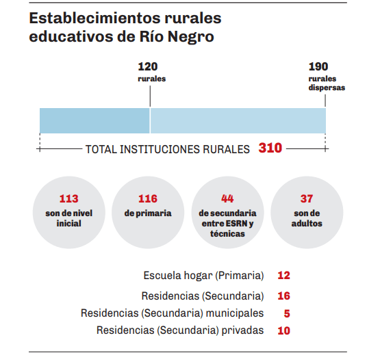La oferta en el ámbito rural incluye nivel inicial, primaria, secundaria (ESRN y técnicas) y también hay escuelas para adultos. Además 12 primarias tienen hogar y hay 31 residencias para secundaria de gestión provincial, municipal y privadas.