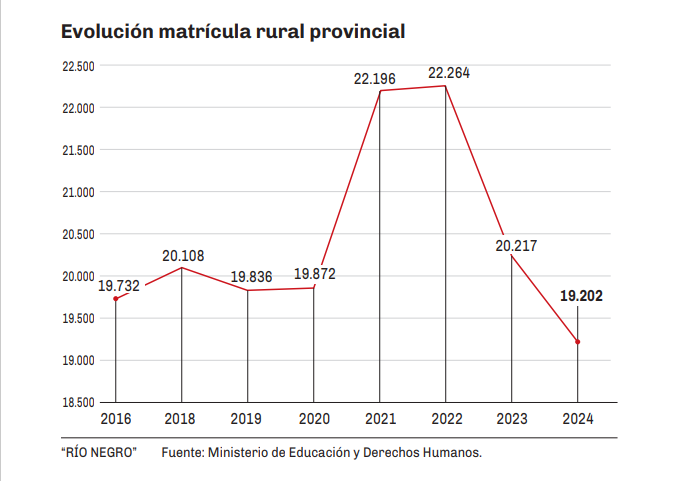 La evolución de la matrícula en las escuelas rurales en general tuvo vaivenes en los últimos años y lo más llamativo es que en la pandemia registró su pico máximo de alumnos desde 2016 a la actualidad. En 2020 y 2021, cuando posiblemente muchas familias decidieron quedarse en sus parajes o campos, se llegó a tener 22.196 y 22.264 alumnos, respectivamente, en las 310 escuelas rurales de todos los niveles. Y de golpe bajó en 2023 a 20.217 y aún más pronunciada fue la caída en 2024, con 19.202 estudiantes en total.