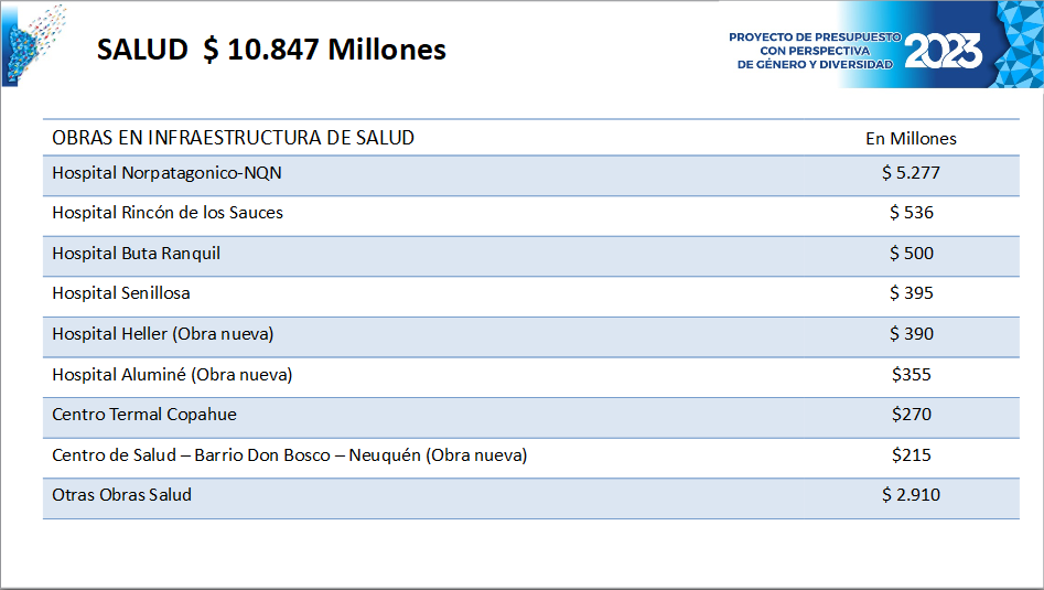 El gobernador Omar Gutiérrez dará a conocer recién mañana el proyecto de presupuesto 2023 para Neuquén, pero hoy anticipó dos de las novedades que serán parte del texto que enviará a la Legislatura. Por un lado, será el primero en la provincia en incorporar la perspectiva de género y diversidad con una metodología de etiquetado para identificar los programas o acciones que puedan ayudar a reducir brechas de desigualdad o promover autonomía de mujeres y diversidades. Y por otro lado, tendrá un porcentaje en obra pública que estará por encima de años previos, con una cifra de casi 101.000 millones de pesos.