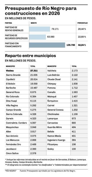 Las mayores obras en Río Negro del próximo año se vinculan con el préstamo del CAF, con un total de 140 millones de dólares, y el aporte del bono VMOS, que sumó 60 millones de dólares. Igualmente, ambas asignaciones no se aplican totalmente en el 2026.