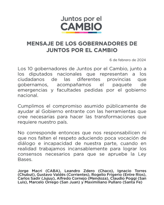 Ante esos ataques los mandatarios de diez provincias, señalaron que cumplieron con el compromiso de «ayudar al Gobierno entrante con las herramientas que cree necesarias para hacer las transformaciones», por lo que no corresponde que se los responsabilice ni falten el respeto «aduciendo poca vocación de diálogo e incapacidad de nuestra parte» cuando se trabajó para «lograr los consensos necesarios para que se apruebe la Ley Bases».