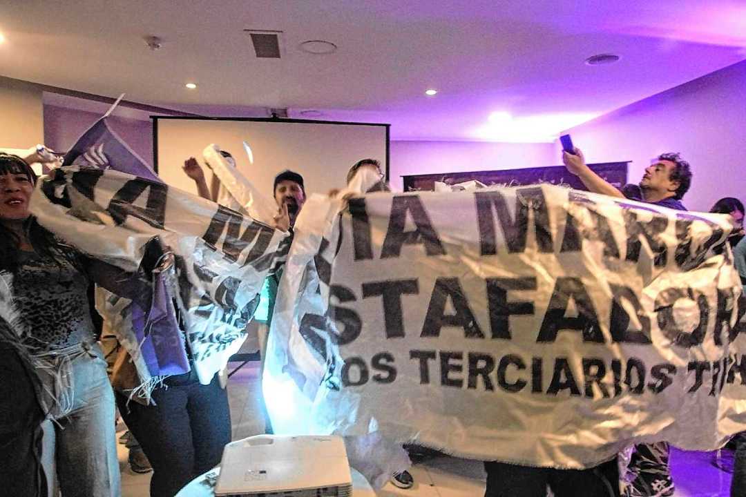 Los libertarios festejaron con cánticos que celebraron a Milei, pero que también que criticaron a sus rivales en la elección. En un momento de la celebración, exhibieron a modo de burla los carteles que habían colgado sus opositores con las leyendas “Nadia estafadora” y “Karina alta coimera”.
