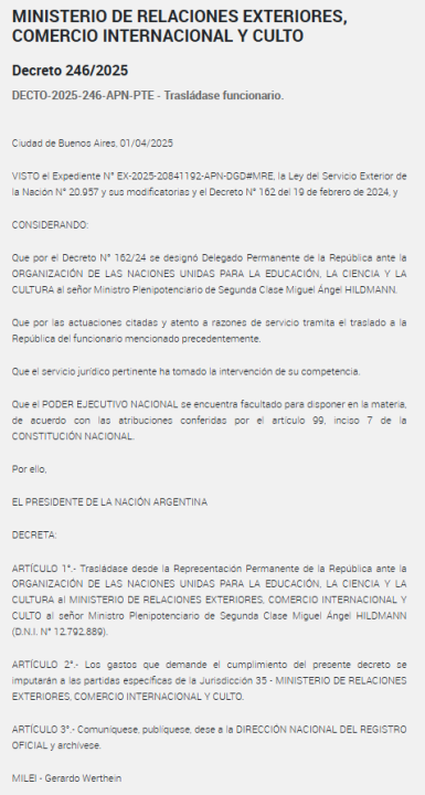 Este es el puesto que quedó vacante, según se conoció este jueves por la publicación en el Boletín Oficial del Decreto 246/2025 que estableció la vuelta al país de Miguel Ángel Hildmann, quien representaba a Argentina en la Unesco.