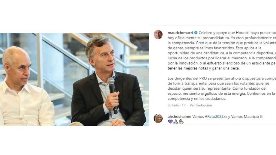 «Celebro y apoyo que Horacio haya presentado oficialmente su precandidatura. Yo creo profundamente en la competencia. Creo que de la tensión que produce la voluntad de ganar, siempre salimos favorecidos. Esto aplica a la oportunidad de una candidatura, a la competencia deportiva, a la lucha de los productos por liderar el mercado, a la competencia por la innovación, o al esfuerzo silencioso de un estudiante para tener las mejores notas y ganar una beca». De esta manera opinó el expresidente Mauricio Macri, referente de la oposición, tras conocerse la intención del jefe de Gobierno porteño, Rodríguez Larreta, de avanzar camino a las PASO.