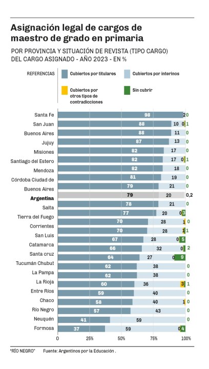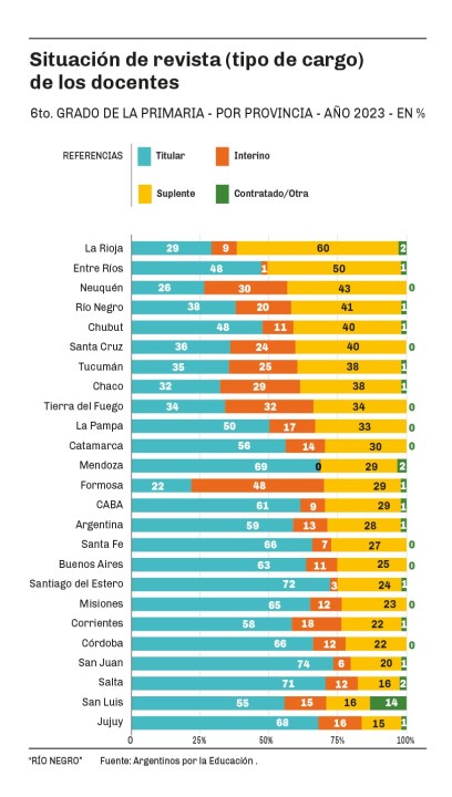 Neuquén y Río Negro aparecen entre las tres provincias del país con menor porcentaje de maestros titulares frente al aula en el Nivel Primario, según un informe difundido esta semana por el Observatorio Argentinos por la Educación.