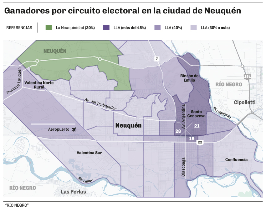 Es que la ciudad de Neuquén concentra un 42,5% del padrón total de la provincia y, junto con sus vecinas de Centenario y Plottier, alcanza a concentrar más de la mitad de los votantes habilitados. Pese a que la candidata fuerte de La Neuquinidad, la ahora senadora electa Julieta Corroza, es oriunda de esta última, en ambas localidades también ganó La Libertad Avanza en todos los circuitos.