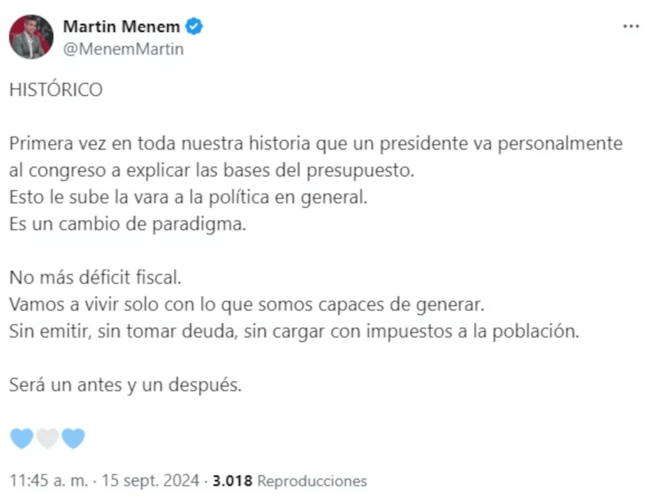 A través de su cuenta de X, Menem calificó este hecho como un «cambio de paradigma» y aseguró que marcará un «antes y un después» en la política nacional. «Esto le sube la vara a la política en general», enfatizó el dirigente, resaltando la importancia de la transparencia en la gestión del Estado.
