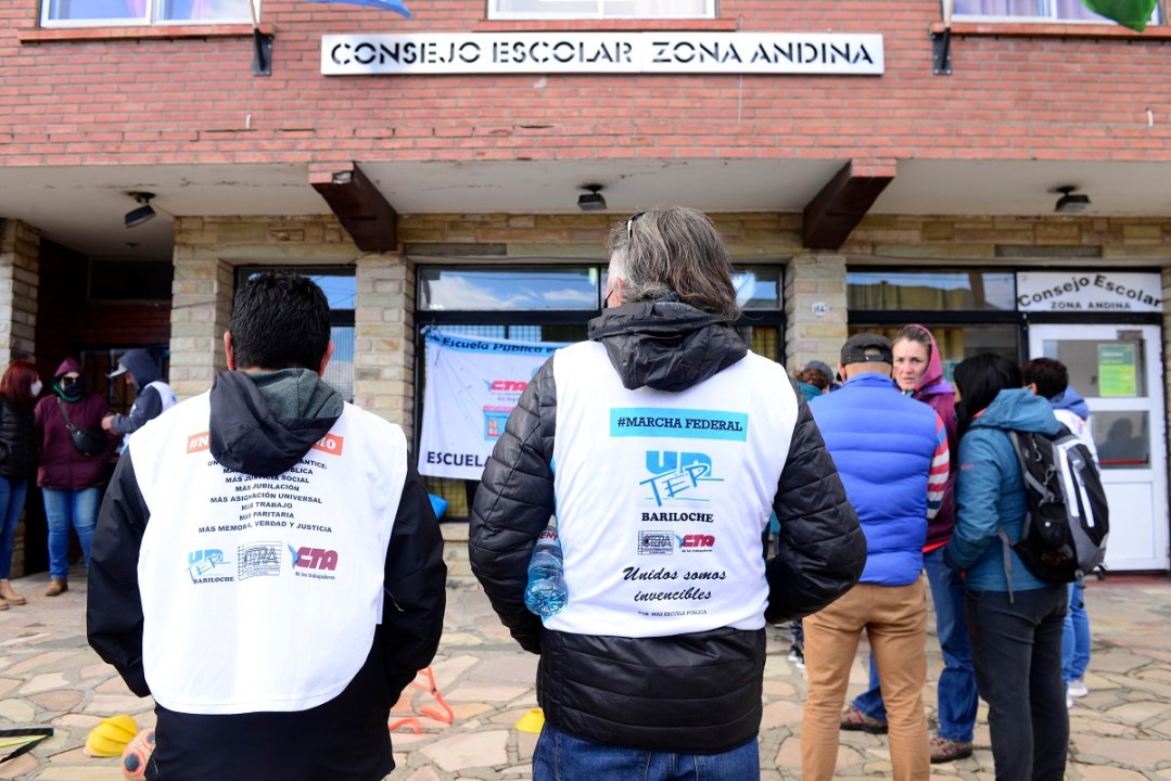 El gremio de los docentes Unter, junto a profesores de Educación Física, se movilizó hoy frente al Consejo Escolar Zona Andina para pedir explicaciones a las autoridades respecto de la falta de espacios para cubrir la demanda de varios establecimientos educativos y fueron recibidos por la delegada Beatriz Alarcón.