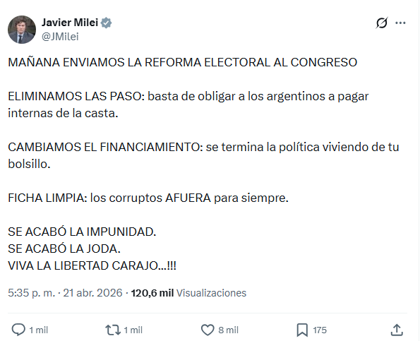El anuncio fue realizado a través de redes sociales, donde el mandatario sostuvo que la iniciativa apunta a “terminar con la impunidad” y cuestionó el actual esquema electoral. “Basta de obligar a los argentinos a pagar internas de la casta”, expresó.