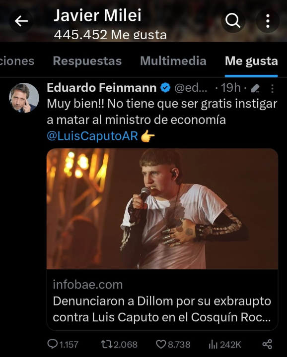 Ante esta situación, que devino en una denuncia penal hacia el artista, Eduardo Feinmann expresó su apoyo a la denuncia en redes sociales, declarando que no se debería tolerar la incitación a la violencia gratuita. Como contrapartida, su mensaje recibió un «like» del presidente de la Nación, Javier Milei, quien respaldó firmemente su postura y criticó las acciones del trapero.