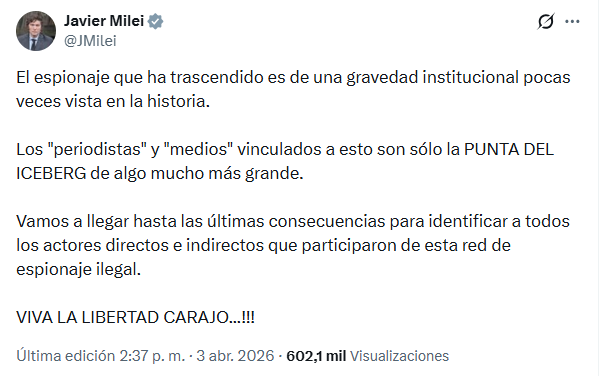 El mandatario sostuvo que el “espionaje que ha trascendido es de una gravedad institucional pocas veces vista en la historia” y apuntó contra periodistas y medios que, según afirmó, estarían vinculados a la maniobra. “Son sólo la punta del iceberg de algo mucho más grande”, escribió en su cuenta de X.