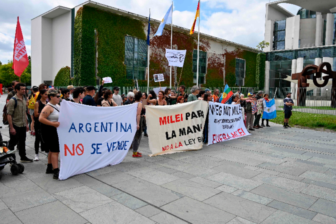 Frente a la cancillería, manifestantes se congregaron para protestar contra la visita de Milei, portando carteles con lemas como «Fuera Milei» y gritando consignas como «Milei, basura, vos sos la dictadura». Este clima de tensión no impidió que el encuentro se desarrollara según lo previsto, aunque acortado y sin la cobertura mediática inicialmente planificada.