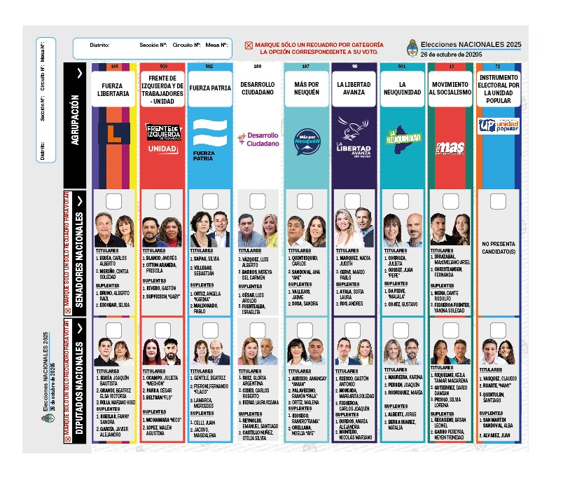 Las que llevarán candidatos a senadores y diputados son La Neuquinidad, La Libertad Avanza, Fuerza Patria, Fuerza Libertaria, Más por Neuquén, el FIT Unidad, Movimiento al Socialismo y Desarrollo Ciudadano. La que irá con boleta corta es Unidad Popular.