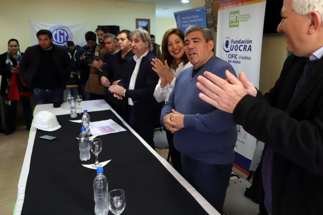 La semana pasada, los días previos al relanzamiento de la CGT Atlántica, la gobernadora Arabela Carreras concurrió a la sede viedmense de la UOCRA y se mostró con el dirigente sindical, aprovechando la firma de convenios y la entrega de elementos para los cursos de albañilería y hormigón.