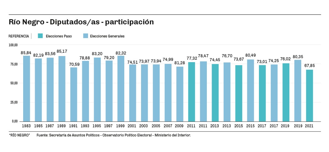 Poniendo la mirada en las elecciones para diputados nacionales, como las que habrá este año en Río Negro, luego del piso del 67,85% de las PASO 2021, nunca hubo menos del 70% de participación.