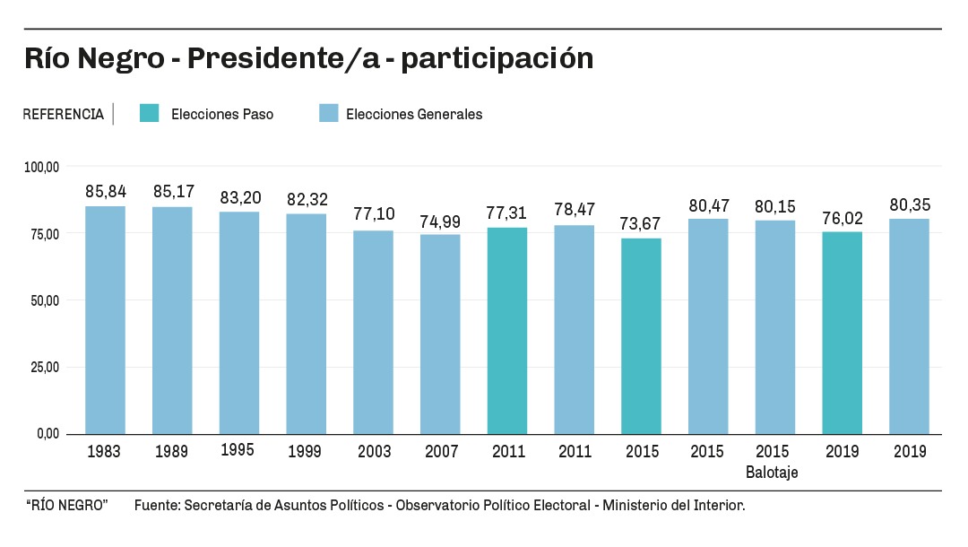 Estallido político y social mediante, desde el 2003 la concurrencia empezó a ubicarse dentro de la franja del 70 al 80 por ciento, mostrando al 2015 como una bisagra, porque las PASO de ese año fueron las elecciones presidenciales con menos participación en cuatro décadas, pero al mismo tiempo, los comicios generales marcaron el regreso a las convocatorias por encima del 80% del padrón rionegrino.