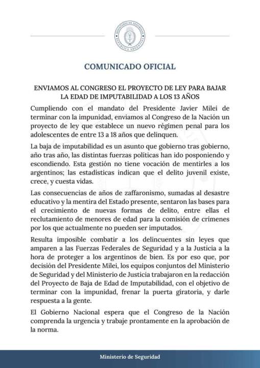“Resulta imposible combatir a los delincuentes sin leyes que amparen a las Fuerzas Federales de Seguridad y a la Justicia a la hora de proteger a los argentinos de bien. Es por eso que, por decisión del Presidente Milei, los equipos conjuntos del Ministerio de Seguridad y del Ministerio de Justicia trabajaron en la redacción del Proyecto de Baja de Edad de Imputabilidad, con el objetivo de terminar con la impunidad, frenar la puerta giratoria, y darle respuesta a la gente”, explicaron en una conferencia de prensa conjunta entre ambos funcionarios.