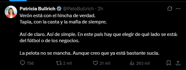 “Verón está con el hincha de verdad. Tapia, con la casta y la mafia de siempre”, escribió Bullrich en su cuenta de X (ex Twitter), al tomar posición en medio del debate abierto en el seno del fútbol argentino respecto del futuro institucional de la AFA y la Copa a Rosario Central.