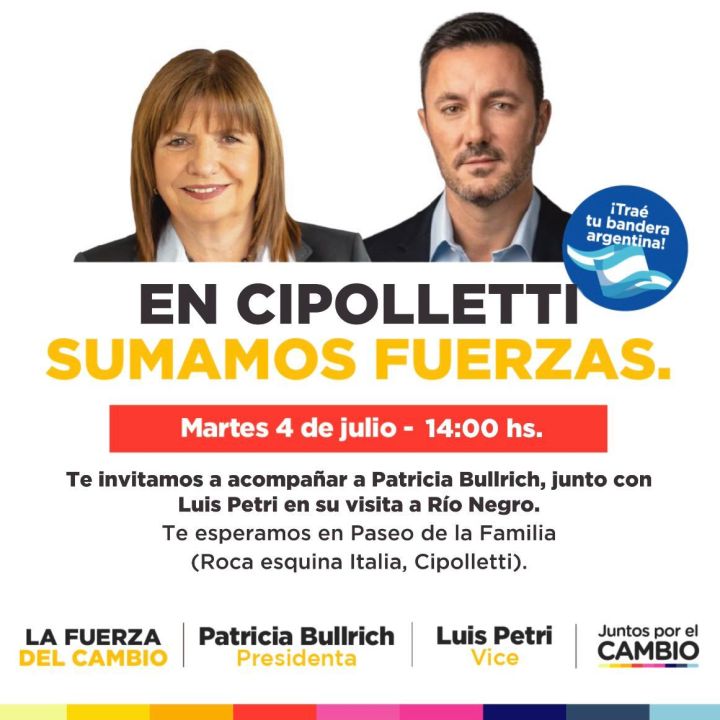 De cara a las PASO en Argentina, la precandidata a presidenta Patricia Bullrich visitará Cipolletti para inaugurar el búnker de su partido. En las internas para las elecciones presidenciales, Bullrich va acompañada de Luis Pietri en el espacio político llamado “La fuerza del cambio”.