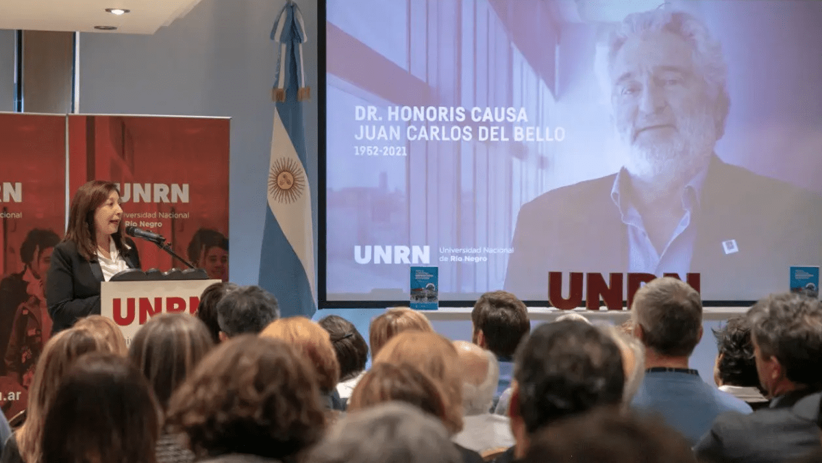 La Universidad Nacional de Río Negro (UNRN) entregó este lunes el título de Doctor Honoris Causa Post Mortem al exrector Juan Carlos Del Bello en un acto emotivo en el que participó el ministro de Educación de la Nación, Jaime Perczyk y la gobernadora Arabela Carreras, junto al actual rector de la casa de altos estudios Anselmo Torres.